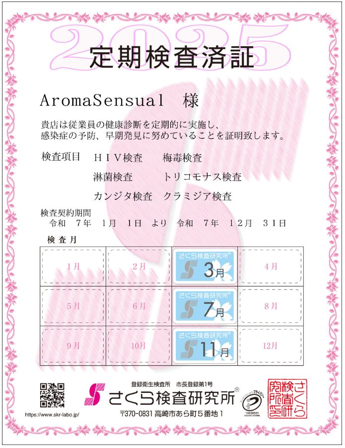 サイドバーにも貼っていますが、左の定期検査済証をクリックしていただけますと、性感染症の定期検査を受けた事がさくら検査研究所様のサイトで確認できます。